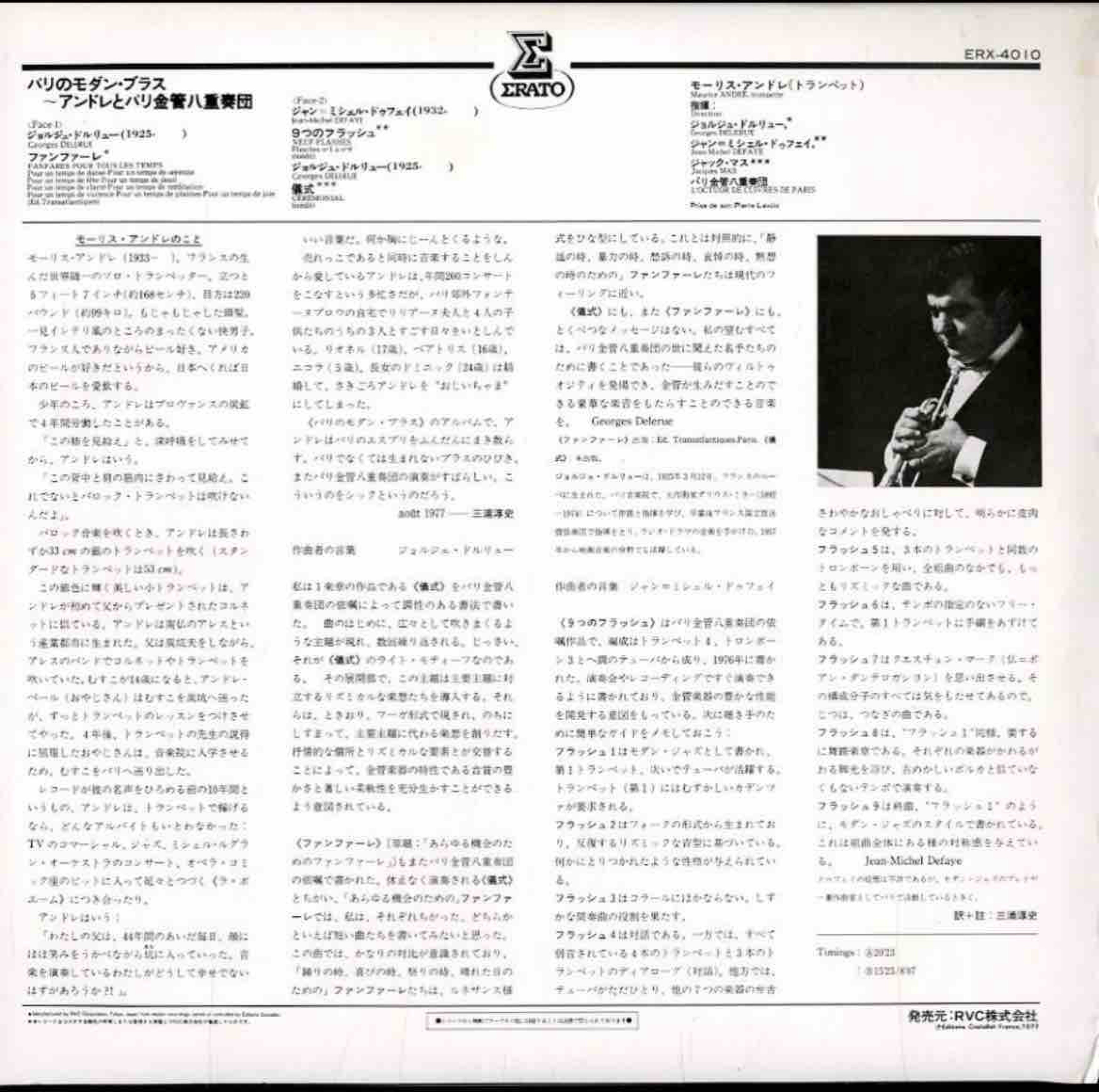 Maurice Andre (trumpet), Octuor de Cuivres de Paris: Pierre Pollin, Yves Coueffe, Jean Pirot, Roger Jeanmarie, Bernard Soustrot, Jean-Paul Leroy (trumpets), Alain Manfrin, Jacky Fourquet, Michel Becquet, Pierre Girard, Guy Destanque, Claude Durand (trombones), Leopold Desmeulles (tuba)