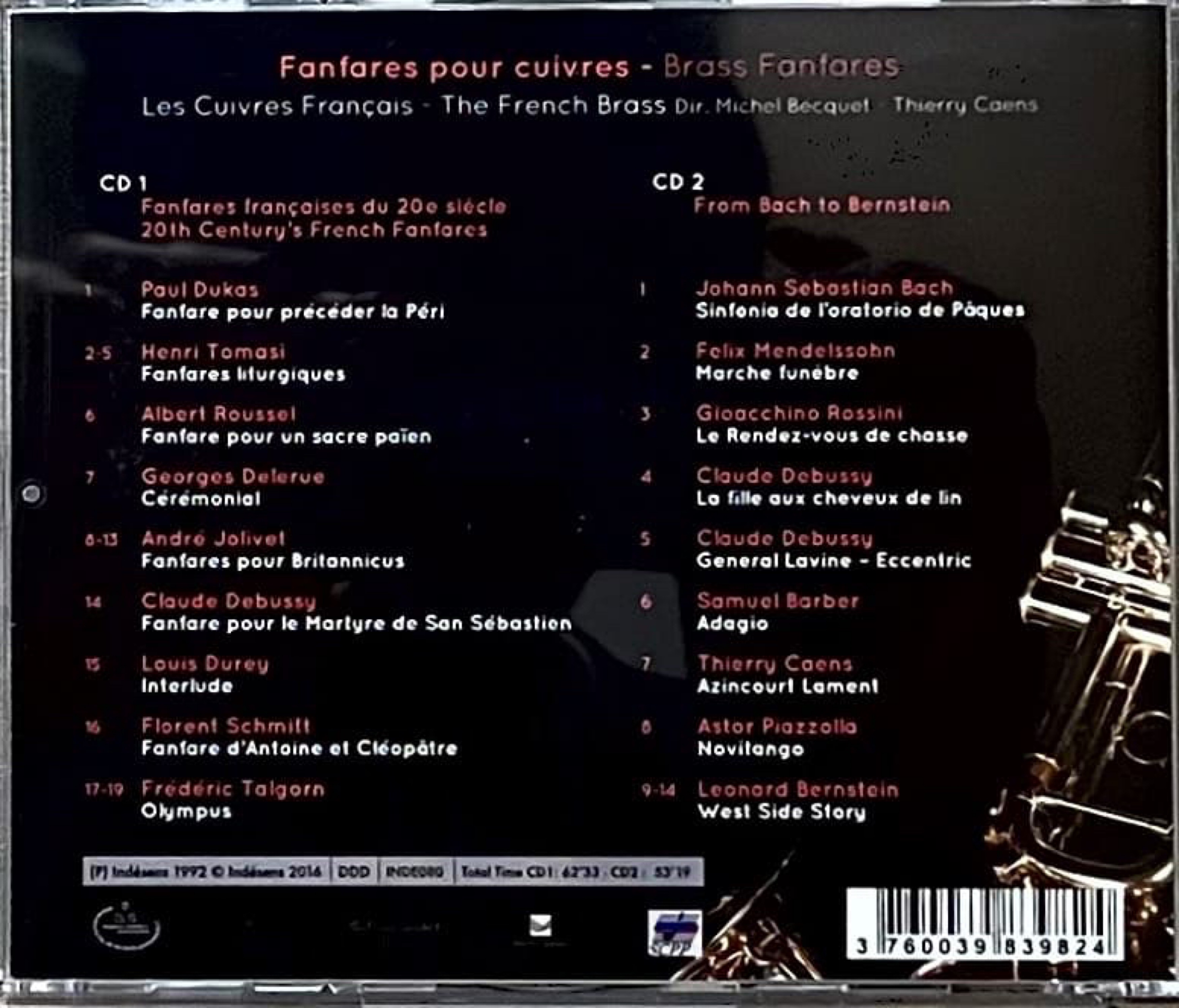 Les Cuivres Français , Dir.CD1:Michel Becquet,Frédéric Talgorn , Dir.CD2:Thierry Caens , Trompettes: Thierry Caens, Pascal Clarhaut, Clément Garrec, Pierre Gillet,Bruno Krattli, Philippe Liztler, Gilles Mercier, Bruno Nouvion, Luc Rousselle, Franck Pulcini , Cors: Jean Joacgues Justafré, André Cazalet, Morc Chamt, Philippe Delmasso , Trombones: Patrice Buecher, Bruno Flahou, Jean Raffard , Trombones basses: Claude Chevallier, Frédéric Potier , Tubas: André Gilbert, Mel Culbertson, Victor Letter , Percussions: Guy-Joël Cipriani, Christian Bellaigues, Didier Beneti, Pascal Delage, Jean-Marc Garilli, Michel Gastaud, Philippe Mace, Franck Tortiller, Christophe Vella