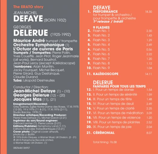 ①Performance for trumpet & orchestra②9 Flashes-Flash No. 1-Jean-Michel Defaye③9 Flashes-Flash No. 2-Jean-Michel Defaye④9 Flashes-Flash No. 3-Jean-Michel Defaye⑤9 Flashes-Flash No. 4-Jean-Michel Defaye⑥9 Flashes-Flash No. 5-Jean-Michel Defaye⑦9 Flashes-Flash No. 6-Jean-Michel Defaye⑧9 Flashes-Flash No. 7-Jean-Michel Defaye⑨9 Flashes-Flash No. 8-Jean-Michel Defaye⑩9 Flashes-Flash No. 9-Jean-Michel Defaye⑪Kaleidoscope⑫Fanfares Pour Tous Les Temps- I. Pour un temps de danse-Georges Delerue⑬Fanfares Pour Tous Les Temps- II. Pour un temps de réveil-Georges Delerue⑭Fanfares Pour Tous Les Temps- III. Pour un temps de mauvais temps-Georges Delerue⑮Fanfares Pour Tous Les Temps- IV. Pour un temps de souvenir-Georges Delerue⑯Fanfares Pour Tous Les Temps- V. Pour un temps de cérémonie-Georges Delerue⑰"Fanfares For A New Theatre"- I. Fanfare for brass quintet-Peter Maxwell Davis⑱"Fanfares For A New Theatre"- II. ...-Peter Maxwell Davis⑲"Fanfares For A New Theatre"- III. ...-Peter Maxwell Davis⑳"Fanfares For A New Theatre"- IV. March for brass quintet-Peter Maxwell Davis㉑Ceremonial-Georges Delerue